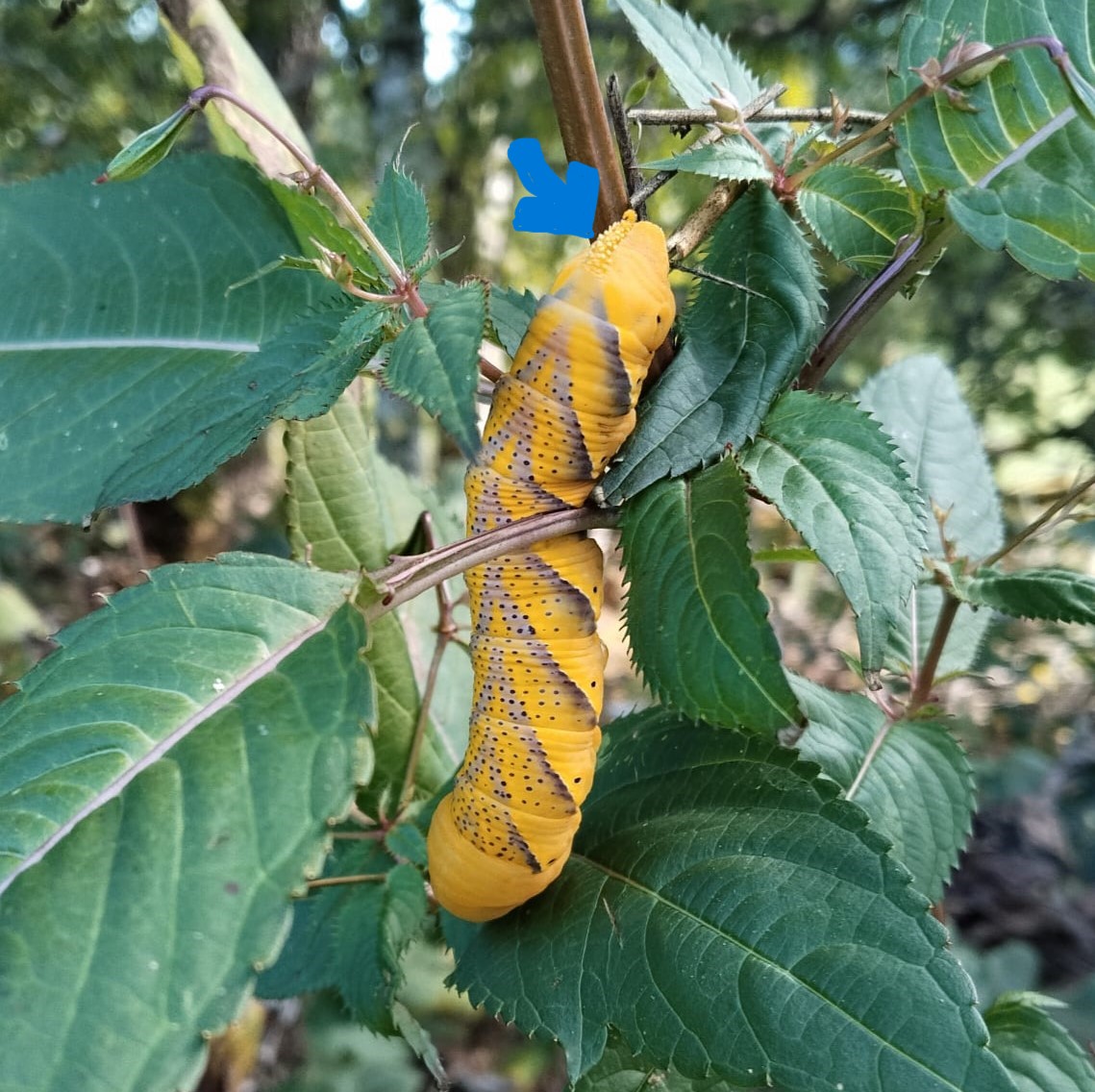 So konnte in der Nähe auch die Raupe eines Totenkopfschwärmers (Abb. 2) beobachtet werden. Diese ist wohl aus dem Ei eines Weibchens geschlüpft, das vermutlich zuerst das Mittelmeer überqueren musste. Schwärmer-Raupen besitzen am Hinterende ein sogenanntes „Analhorn“ (blauer Pfeil). Kurz vor ihrer Verpuppung färben sich diese Raupen von leuchtend grün zu gelb.
