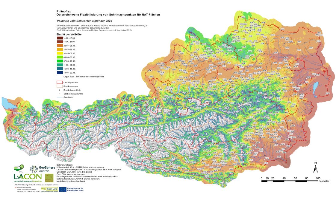 Die Holunder-Vollblüte hilft auch den Teilnehmer:innen von Schnittzeit nach Phänlogie den optimalen Mahdzeitpunkt für ihre Wiesen zu erkennen. Seit 2015 werden österreichweite Karten zur Vollblüte (Bild 3) berechnet. Zu allen Karten.