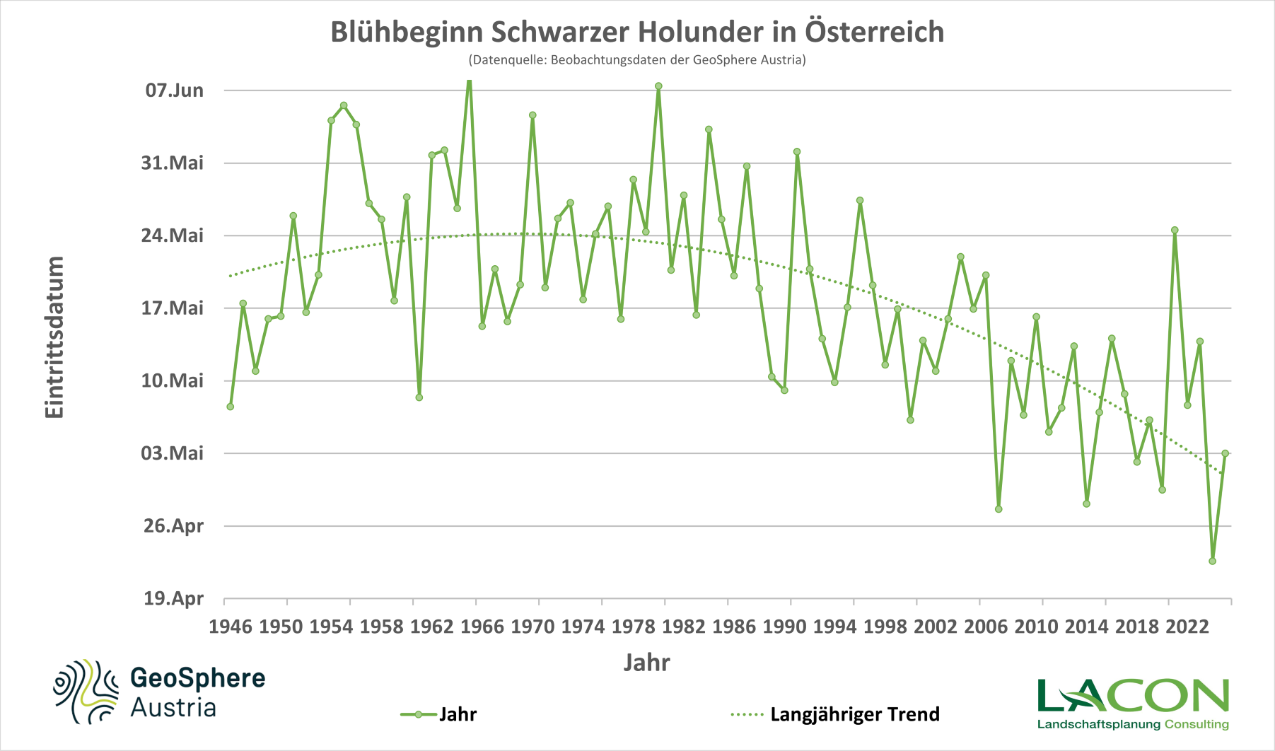Der Blühbeginn des Schwarzen Holunders wird von zahlreichen Teilnehmer:innen in Phänoflex beobachtet und dient der Erstellung der jährlichen Vorverlegungskarte. Anhand der "Fieberkurve" (Bild 2) erkennt man, dass das Phänomen immer früher beobachtet wird.